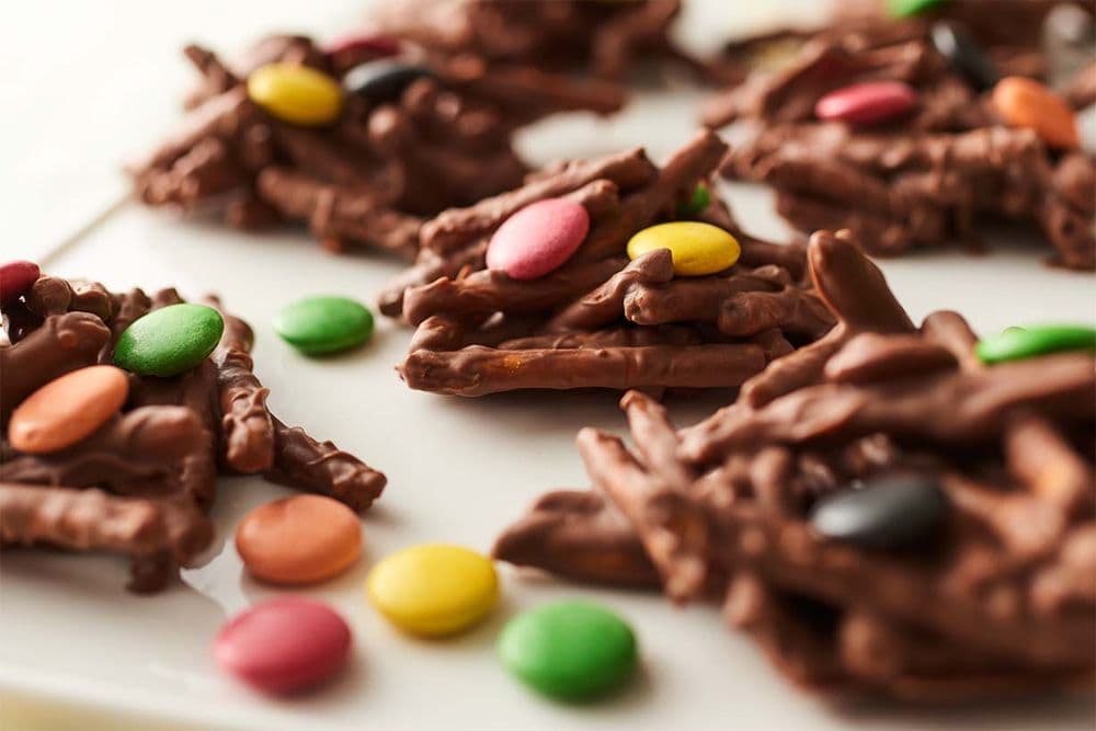 Dela salta pinnarna i mindre bitar. Smält chokladen i ett vattenbad (alt. micro) och rör i de brutna salta pinnarna. Klicka ut små ”fågelbon” på en plåt/bricka med bakplåtspapper och placera Non Stop/Never Stop i bona innan chokladen stelnar.